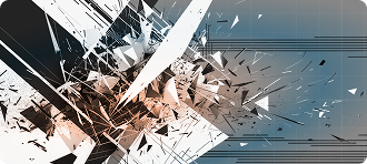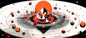 Ilustração de arquitetura digital: pessoa diante de portal geométrico brilhante em meio a formas abstratas preto, branco e laranja.